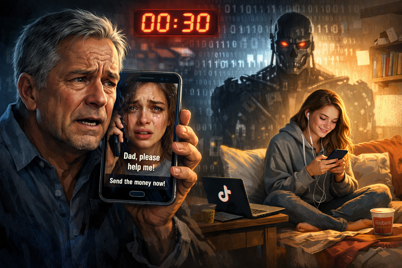 Except your daughter is sitting in her college dorm room, eating ramen, scrolling TikTok. She never called you. She was never in danger. The voice you heard — the one that sounded exactly like her, down to the way she says "Mom" when she's scared — was generated by an AI in under ten seconds.
